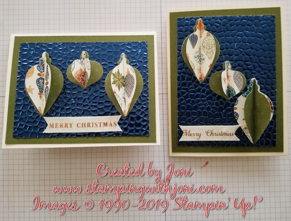 For this card you will need a Thick Very Vanilla Card Base, Mossy Meadow Mat, Blue Peacock Foil Paper for inner mat, Brightly Gleaming Designer Series Paper with the ornament punch, and ribbon.