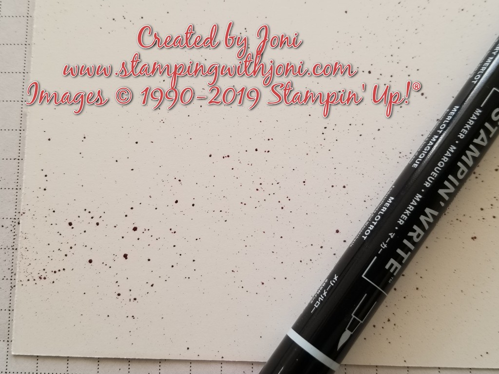 Take a Stampin’ Write Marker (not the Blends) and make a flicking motion with the cap against the tip. That motion will release ink to create a splattered background.
