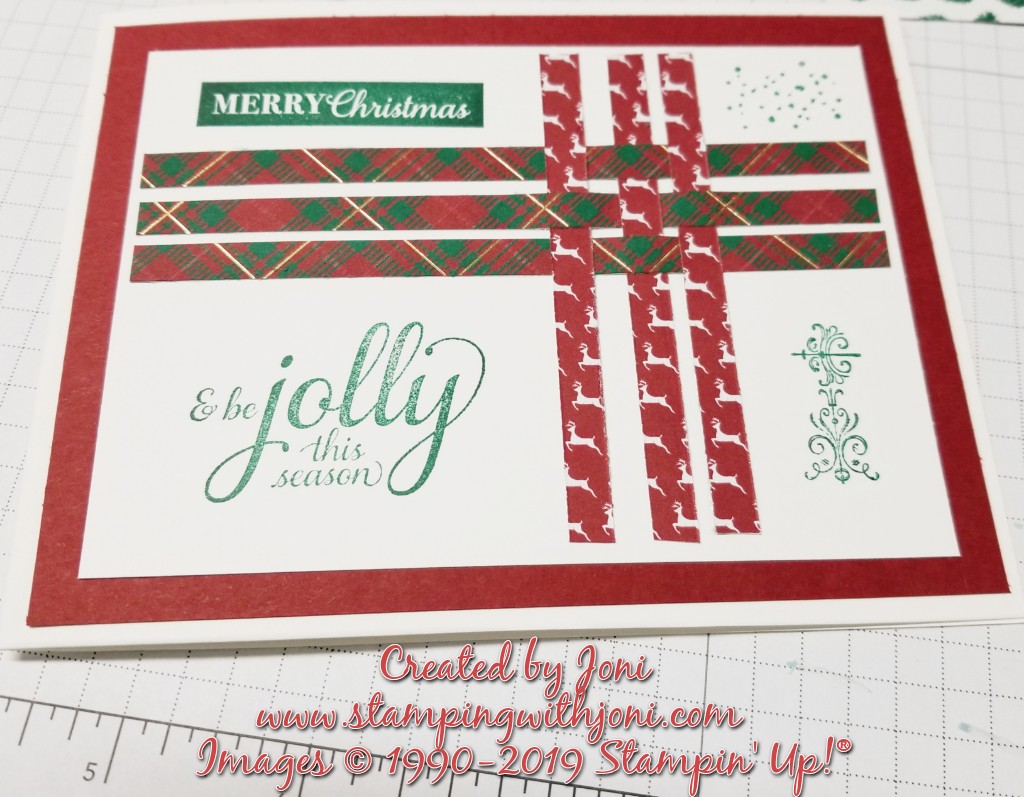 It’s Technique Tuesday! Today we are being scrappy. We are using our scraps to create a woven background. So take some of that paper that is left from the project that is already finished or maybe even some paper that you didn’t care for. Cut the strips as thin as you can get them (not more than 1/8″). Attach them to your card base with Snail Adhesive, but only on one side. This will allow you to weave the paper together.