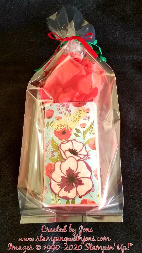 - Cut Whisper White Card Stock and Peaceful Poppies Designer Series Paper at 6 1/8″ X 3 1/8″ to create mat for front and back of bag.