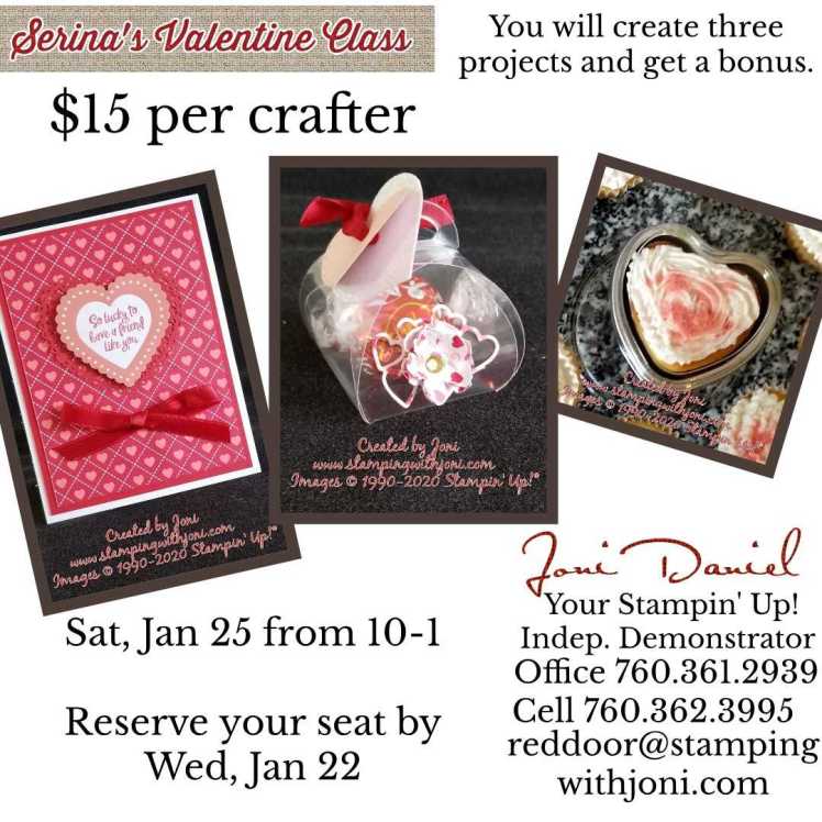 This week Serina is hosting the Valentine’s Favors Class. In this class you will create a card with gift card pocket, a favor with cute tag and realistic looking flower, and a cupcake complete with spray frosting and edible glitter. For $15 you will get all the instructions as well as the recipe for the glitter.