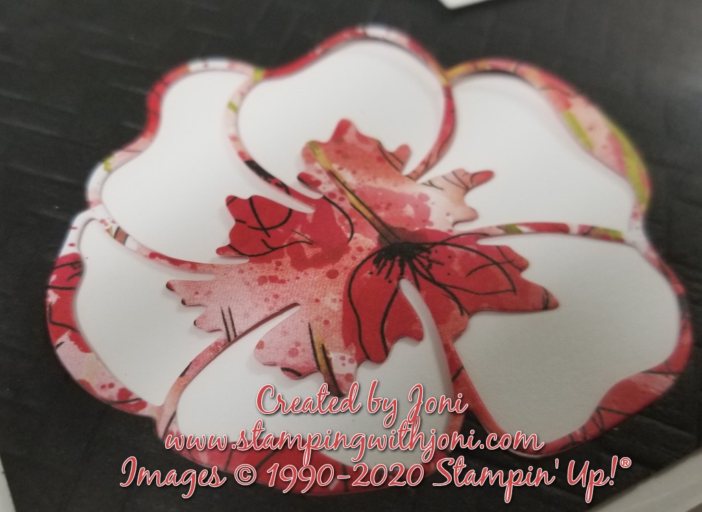 When using the Painted Poppies stamp set and coordinating dies make them inlaid. Instead of having a detailed flower sitting on top of your card that could rip or catch think about cutting out a space for it to lay evenly with the rest of the mat. For this poppy I cut out the black card stock with the coordinating framelit and then cut out the detailed section with the Designer Series Paper.