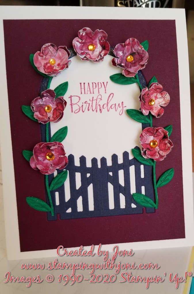 - Cut Blackberry Bliss Card Stock to 5″ X 3 3/4″. Run through die cut machine with gate die. You will use the outside frame and keep the gate for another card. Attach the mat with cutout to the card base.