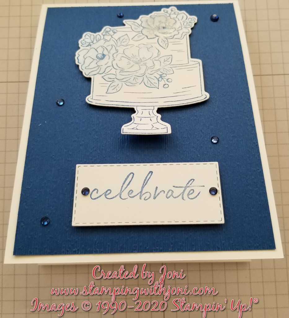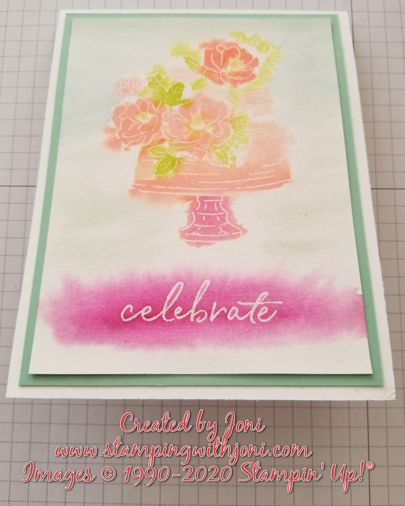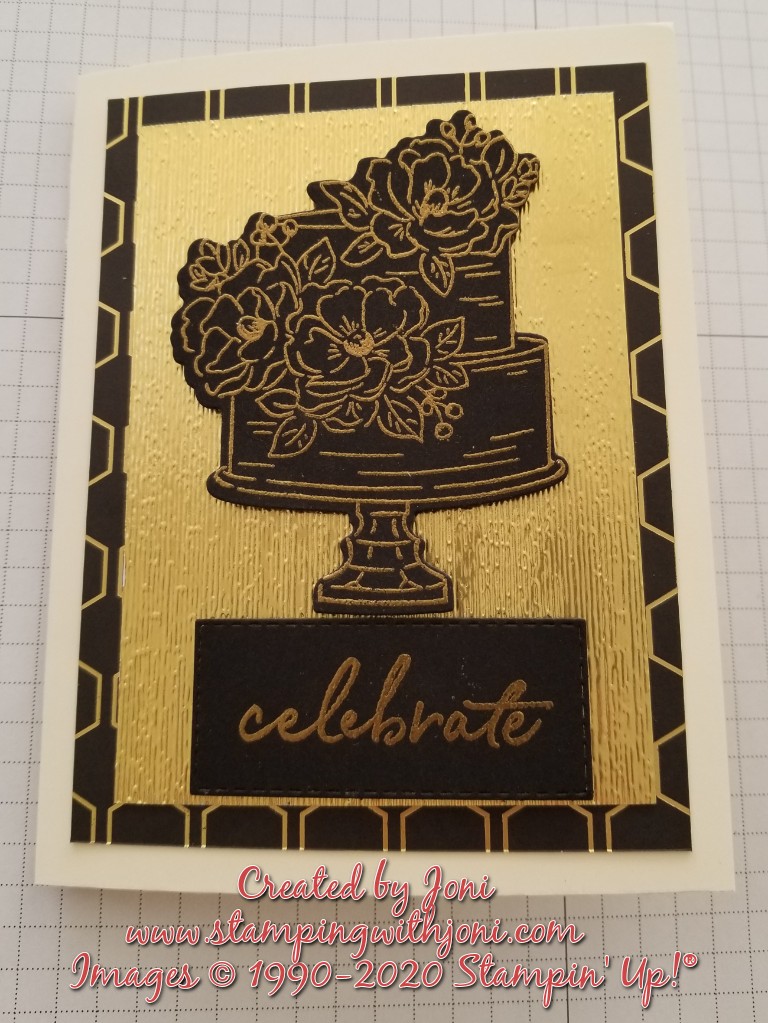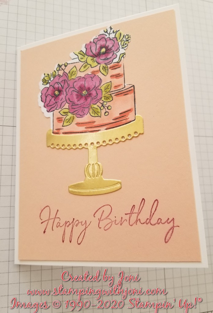 The third card is colored with the Stampin’ Blends and trimmed to fit the gold pedestal. This one is on the video.