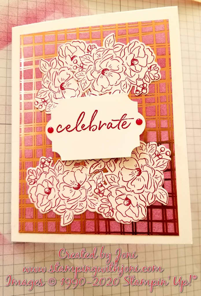 - Cut a mat from the Flowering Foils Specialty Designer Series Paper (available March 3) to 5″ X 3 3/4″. Take a Sponge Brayer and Lovely Lipstick to add background color. Attach to base with Snail Adhesive.