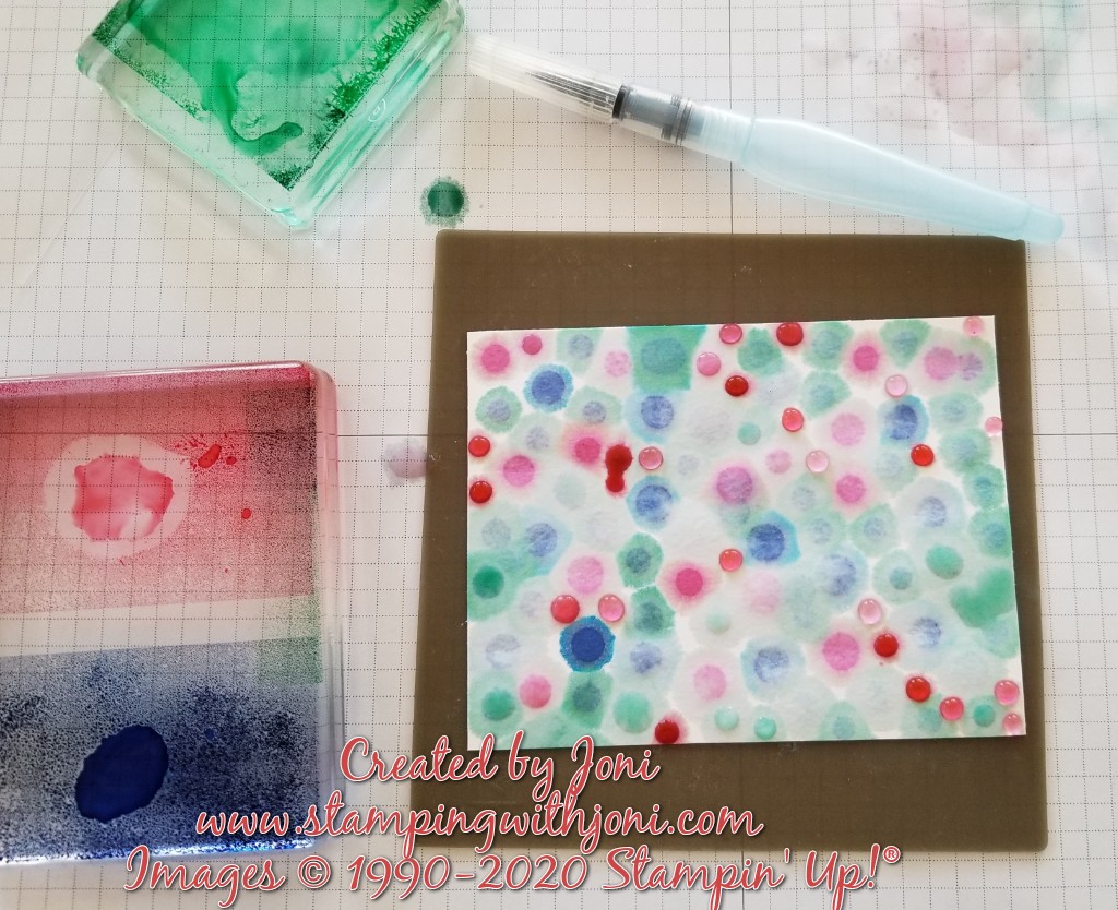 So grab a piece of white card stock, shimmery white card stock, or watercolor paper. If you don’t have a big one then grab scraps and create a mosaic background afterwards. Then you will need an aqua painter. If you don’t have one then grab a cup of water and a paintbrush. An eye dropper will work too. You will then need some ink pads. Stamp some ink on a clear block. If you don’t have blocks a piece of waxed paper will work in a pinch. Then grab your aqua painter or paintbrush. Drop a few drops of water on the block with ink. Give it a swirl and begin dripping inked water on to your card stock. Let dry to create your background.