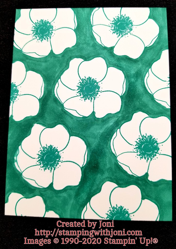 In this case take the Peaceful Poppies Stamp Set and ink the flower randomly to create a background on Whisper White Card Stock. In this case the ink used was Bermuda Bay. Instead of coloring in the poppy I colored in the background with the Dark Bermuda Bay Stampin’ Blends. To lighten up some of the streaks I used the Color Lifter.