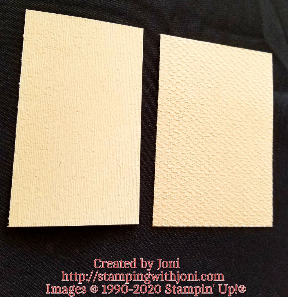Today I want to talk about the texture of things. When you use an embossing folder not only can it be a full background, but it can make things look like something else. For example, this piece of Crumb Cake Card Stock I have textured with the Subtle 3D Embossing Folder as well as the Tasteful Textile 3D Embossing Folder.