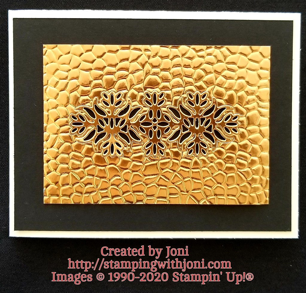For this card the Perfect Parcels Dies and the new Brass Foil Sheets were used to create this gorgeous accent. Finish it off with the Die Cutting Machine and the Hammered Metal 3D Embossing Folder.