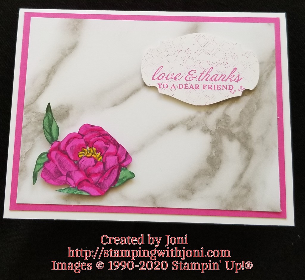 For the first card I have let the Peony Garden Designer Series Paper do all the heavy lifting. The marbled background paired with the peony colored with our Stampin’ Blends (Magenta Madness and Just Jade used) makes for a marvelous card front.