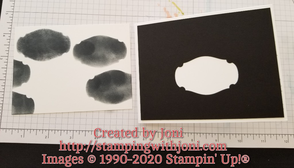 So you start with a card base. Then you cut a mat to 4″ X 5 1/4″. Before sticking it on to the card base you go up as far as you can and punch an accent out. You then use the mat with a hole in it as a stencil to create a background on the inner mat.