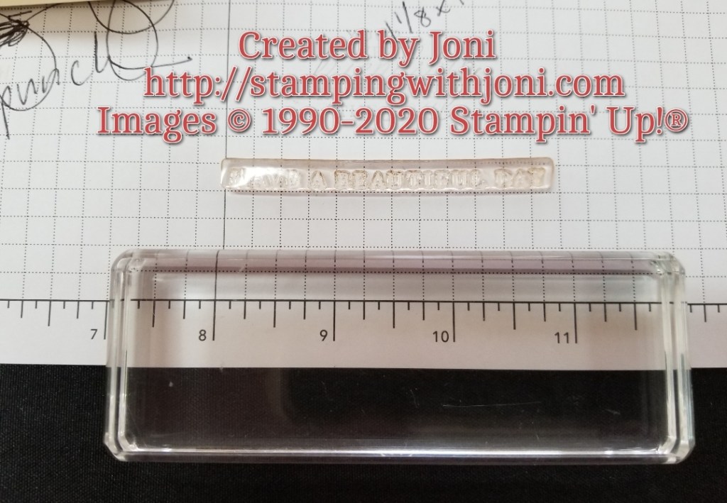 In this case when you have a long, straight stamp do not try to place it directly on the block. Instead lay it on the grid paper to see if it is straight. Then grab a clear block and place over the stamp and push to adhere.