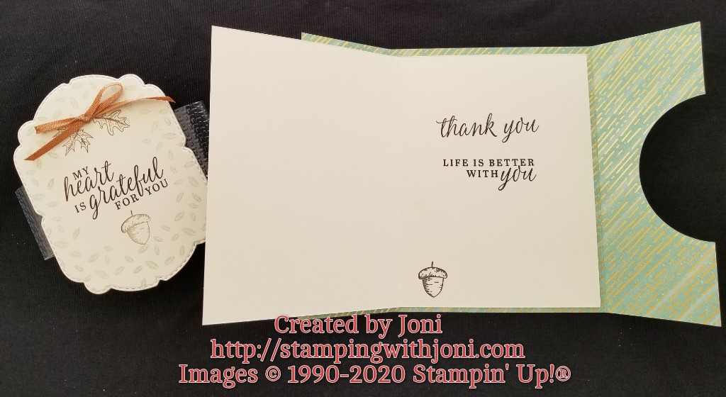 - For the card base you will need Gilded Autumn Specialty Designer Series Paper cut to 5 1/2″ X 8 1/2″. On the 8 1/2″ side score at 2 1/8″ and 6 3/8″. Cut out semi circles for the accent portion with the Layering Circle Dies.