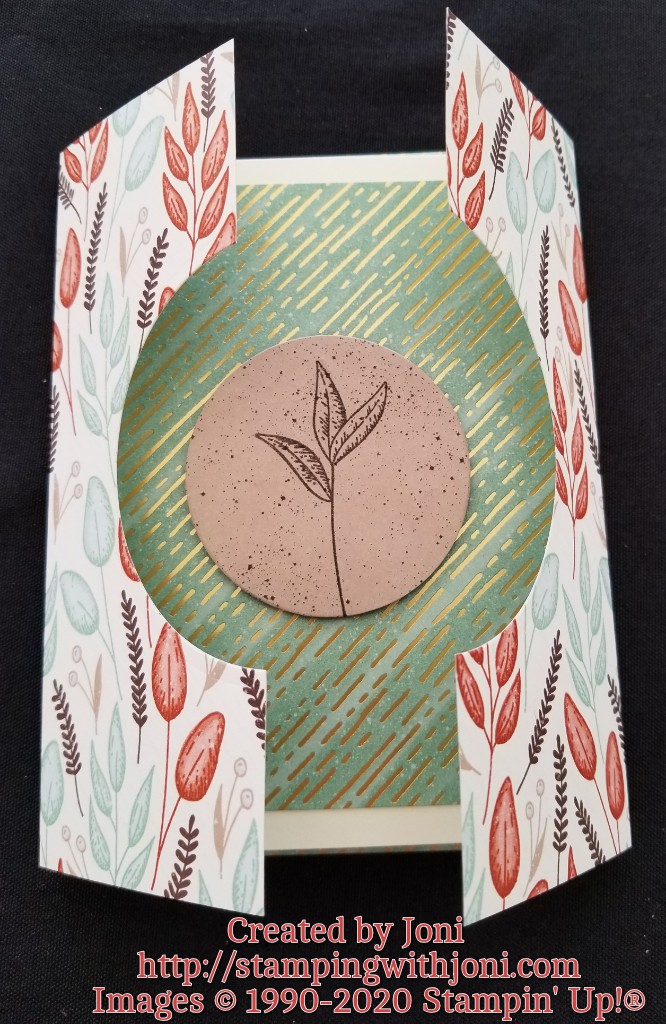 - Out of a scrap of the Gilded Autumn Specialty Designer Series Paper cut out a circle from the Layering Circle Dies. Stamp the stemmed leaf from Beautiful Autumn Cling Stamp Set in Early Espresso Ink.