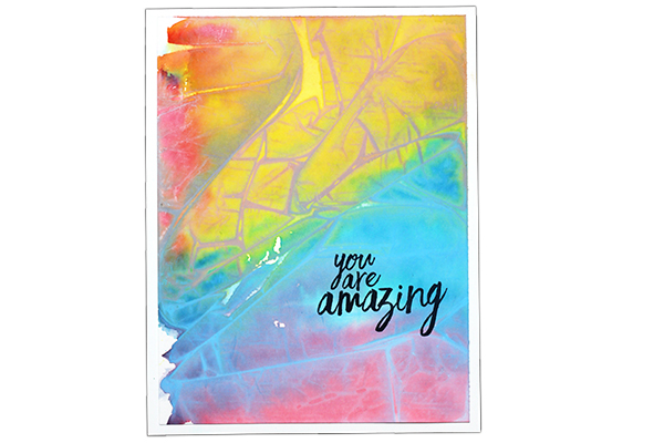 Grab a piece of wrap that is just larger than your card stock mat. Drop ink on it and smoosh around, spritz, do whatever you need to do to make it look “right”. (You might want to do this step over a silicone mat or paper towel so you don’t get ink everywhere.) Then drop the card stock mat on top of all that lovely ink to transfer your background. This will become your background. After you can add shimmer paint to accent or whatever you feel. Then, after it dries, place a label for words and you are ready to go.
