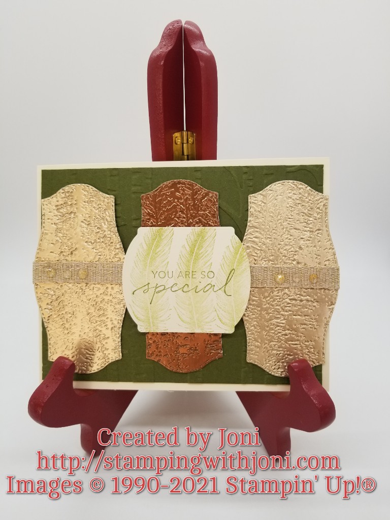 I’ve taken some scraps of foil papers and blended them with care. First I cut them out of the Tasteful Labels Dies and then embossed with the Evergreen Forest 3D Embossing Folder. I want you to remember that just because there is a pine tree on something doesn’t mean it is just for Christmas.