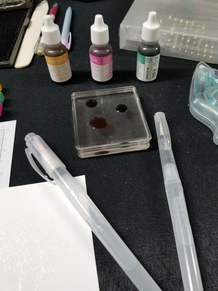 I then dripped one or two drops of water from the brush tip on to the chosen color. When coloring I went to the center of the image and just barely dropped the color. After I moved the ink as I wanted with the brush being careful to not add any more water or ink.