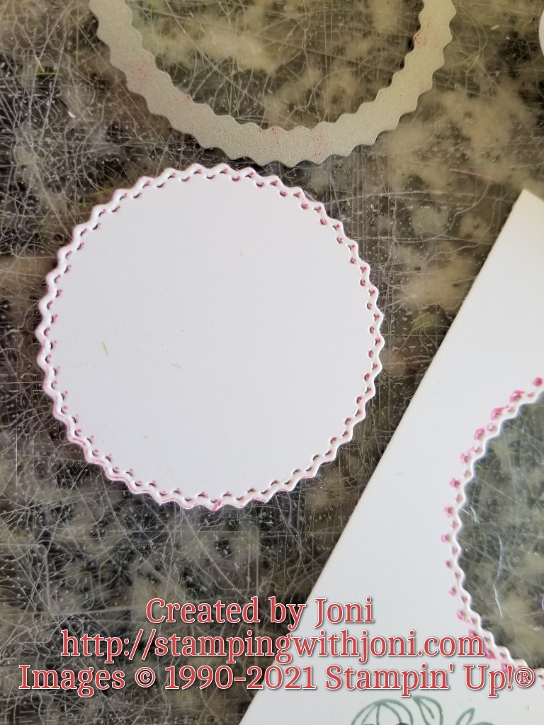 First, you get a die that you want to be outlined in a color. Then you dip it in a color of your choice. Be very careful to just set it down as to not cut the ink pad. Here’s the trick…to not get your fingers full of ink while pulling it up. You can use the putty side of the Take Your Pick Tool and a tweezers to help with this. Then place on your card stock making sure to not slide the inked die around. Run through the Stampin’ Cut & Emboss Machine as usual. You will have a perfectly colored outline afterwards.