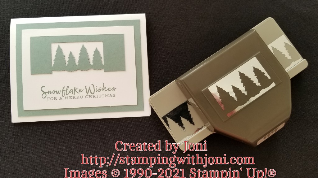 You want to take the Evergreen Border Punch and cut your piece of card stock just slightly taller and wider than the middle of the punch. This will allow a frame to stay after punching so you have this great card front.
