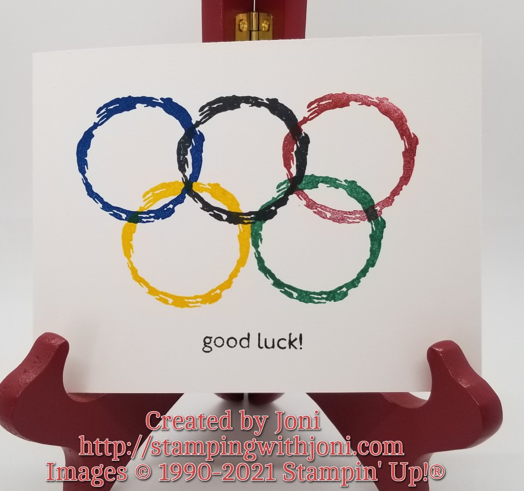 Now, for this card, you will need a simple piece of basic white cardstock (thick if you prefer). That’s all. Then you will need the colors for the rings…pacific point, just jade, real red, daffodil delight, and tuxedo black (memento). The stamps used are Art Gallery Photopolymer Stamp Set (annual catalog) and Textures & Frames Photopolymer Stamp Set (new Sale-A-Bration Brochure).