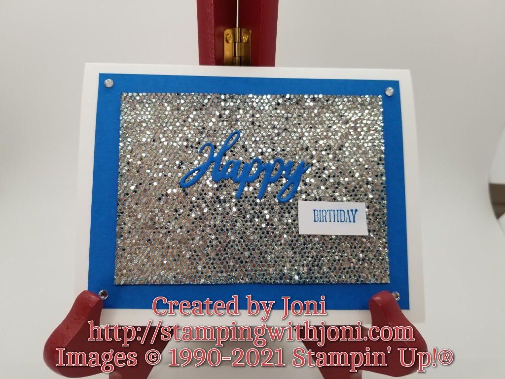 After everything is dry attach in order from card base to mat to sparkles to accents. Don’t forget the bling.