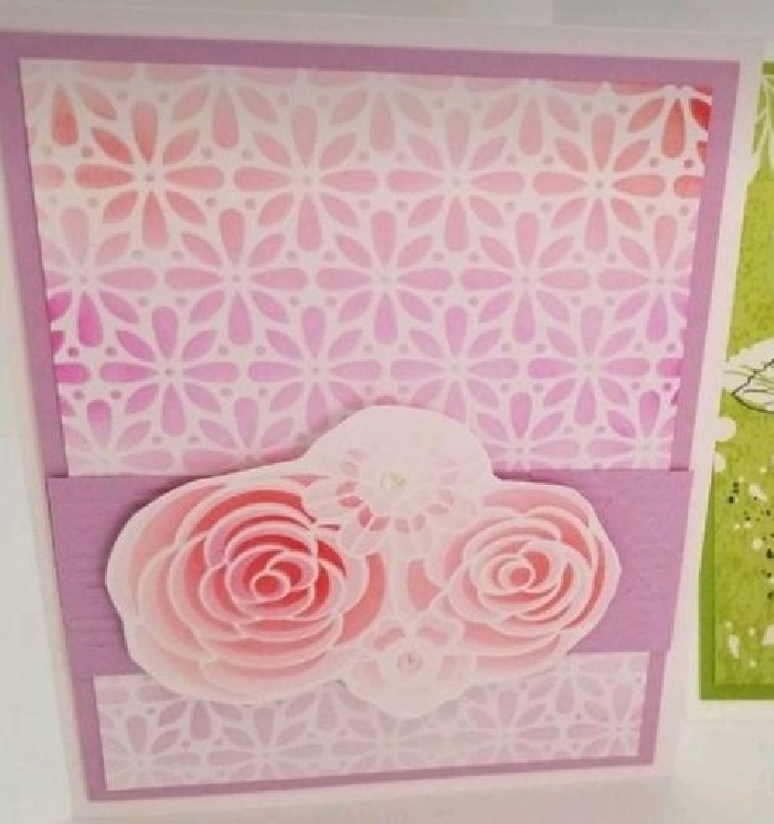Today’s product of choice are the Butterflies & Flowers Layering Decorative Masks on page 65 of the new Mini Catalog. Some of you may know, but many of you may not be aware of all the different ways you can use a mask. Not only can you use it with Embossing Paste and the Palette Knives, but you can also use it with the Spritzer, Blending Brush, Sponge Dauber, and more. Basically whatever way you can apply ink to paper is how you can use the masks. I would not recommend using your ink pad directly on the masks as the plastic tends to cut the pad.