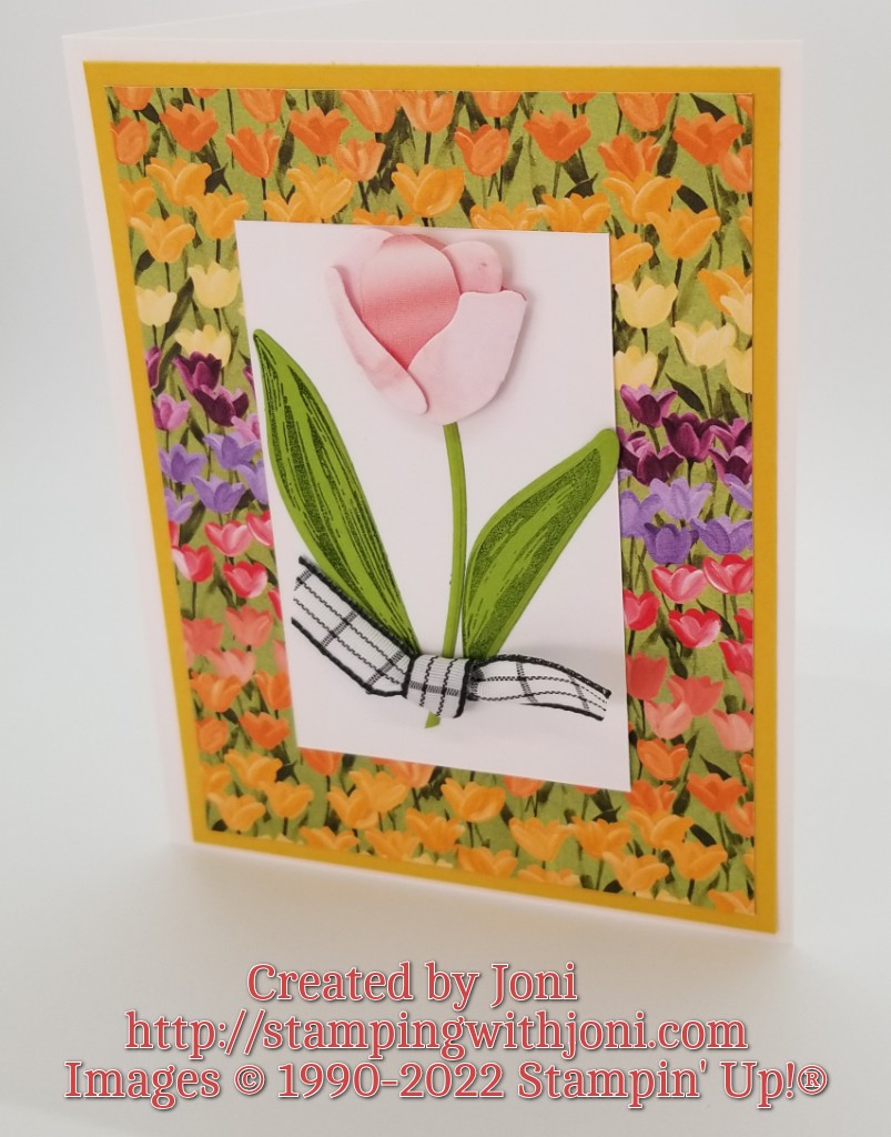 - Cut out of Granny Apple Green Card Stock scraps backed with an Adhesive Sheet for the leaves and the stem. Stamp the leaves with Evening Evergreen Ink. Peel and stick to the accent piece. Cut out the three tulip dies from the Simply Marbelous 6X6 Designer Series Paper. Attach in order (please see video below) with Mini Glue Dots.
