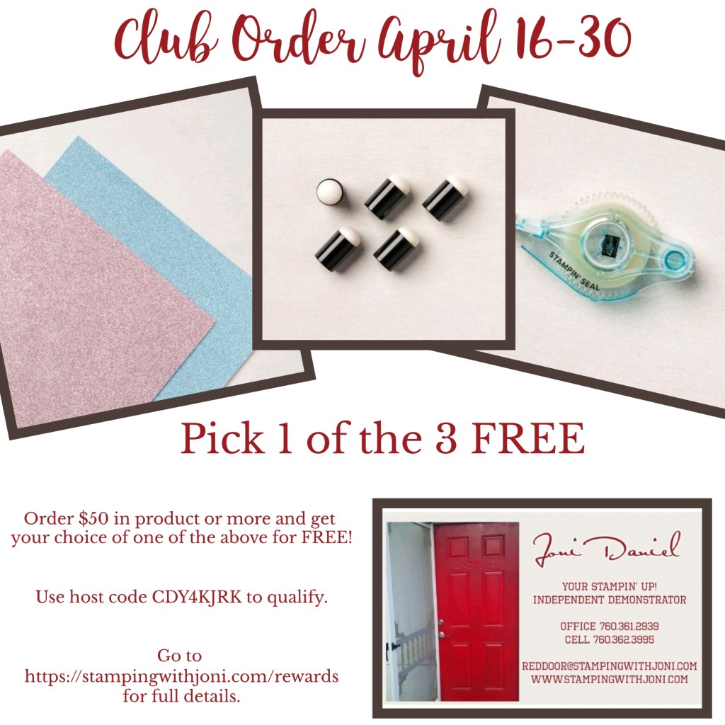 When you would like to order please consider qualifying for the Club order. For this Club from April 16-30 order $50 or more in product with host code CDY4KJRK or using the link https://www.stampinup.com?hostcode=CDY4KJRK to qualify. (You can also place your order directly with me but it will not be submitted until May 1.) There is no commitment unlike past Clubs. There is simply a bonus.