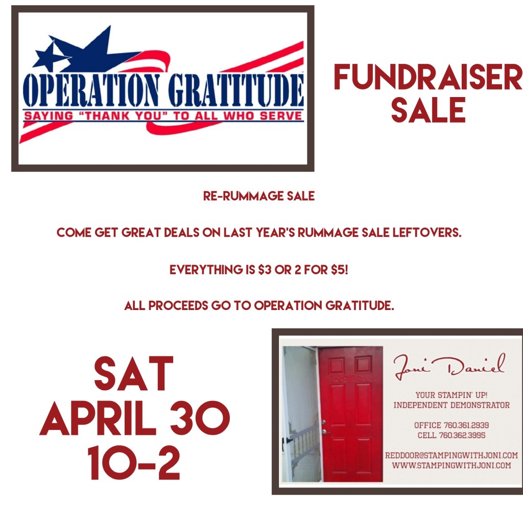 Plan on coming out on Saturday, April 30 for the Re-Rummage Sale! All proceeds will go to Operation Gratitude so they can continue to do care packages for deployed military and first responders. This is a one-time event!