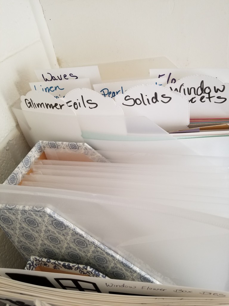 So I thought I would talk about how I organize my Designer Series Papers or 12X12’s. I have magazine holders that are 14 inches across. When I unwrap the paper I take the backing or chipboard and a piece of Basic White Card Stock. With a sharpie or marker I write the name of the paper pack and glue it to the chipboard to create a tab. I then “file” my papers in the holder. I don’t usually worry about dust but I do think about sun. They are pretty protected in these holders.
