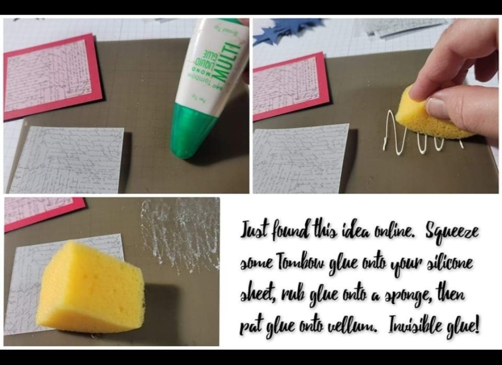 Take a piece of scrap card stock, silicone mat, or a piece of waxed paper and spread some Multipurpose Glue on it. Then grab a sponge or Sponge Dauber and wipe until the glue is in one thin sheet. You can then spread the thin sheet on to the vellum without it being seen. But, you have to work fast because this glue dries quickly when spread thin.
