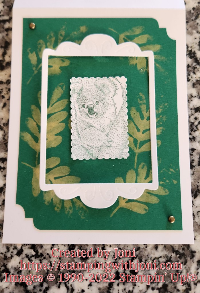 For this specific card I took Shaded Spruce Card Stock and stamped leaves on it to resemble eucalyptus leaves to go with the koala. The ink I used was bleach.