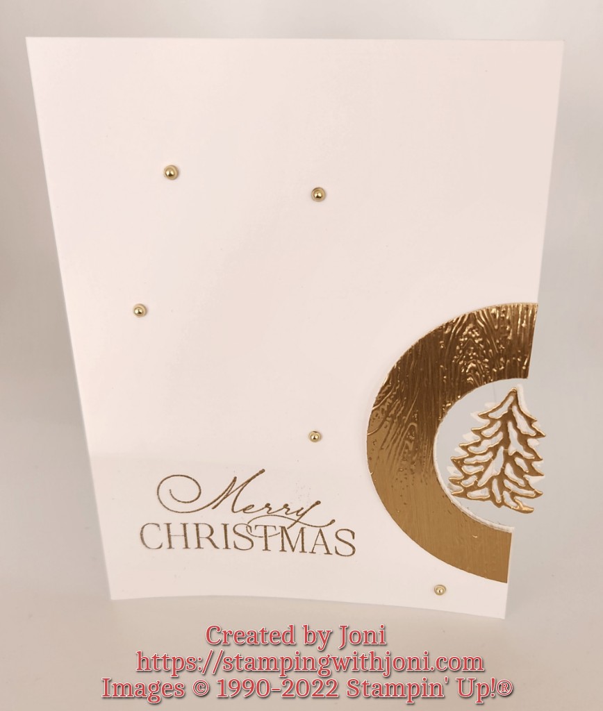 - Take scrap of Brushed Metallic 12” X 12” and cut large circle frame with Layering Circles Dies. Then emboss with Timber 3D Embossing Folder. Cut in half with Snips.