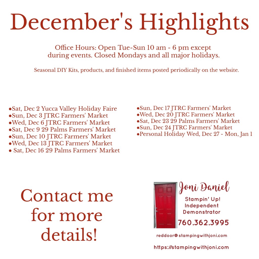 Here are December’s highlights! Please contact me for more details, locations, and times for any of the events. Many have been added for this month!