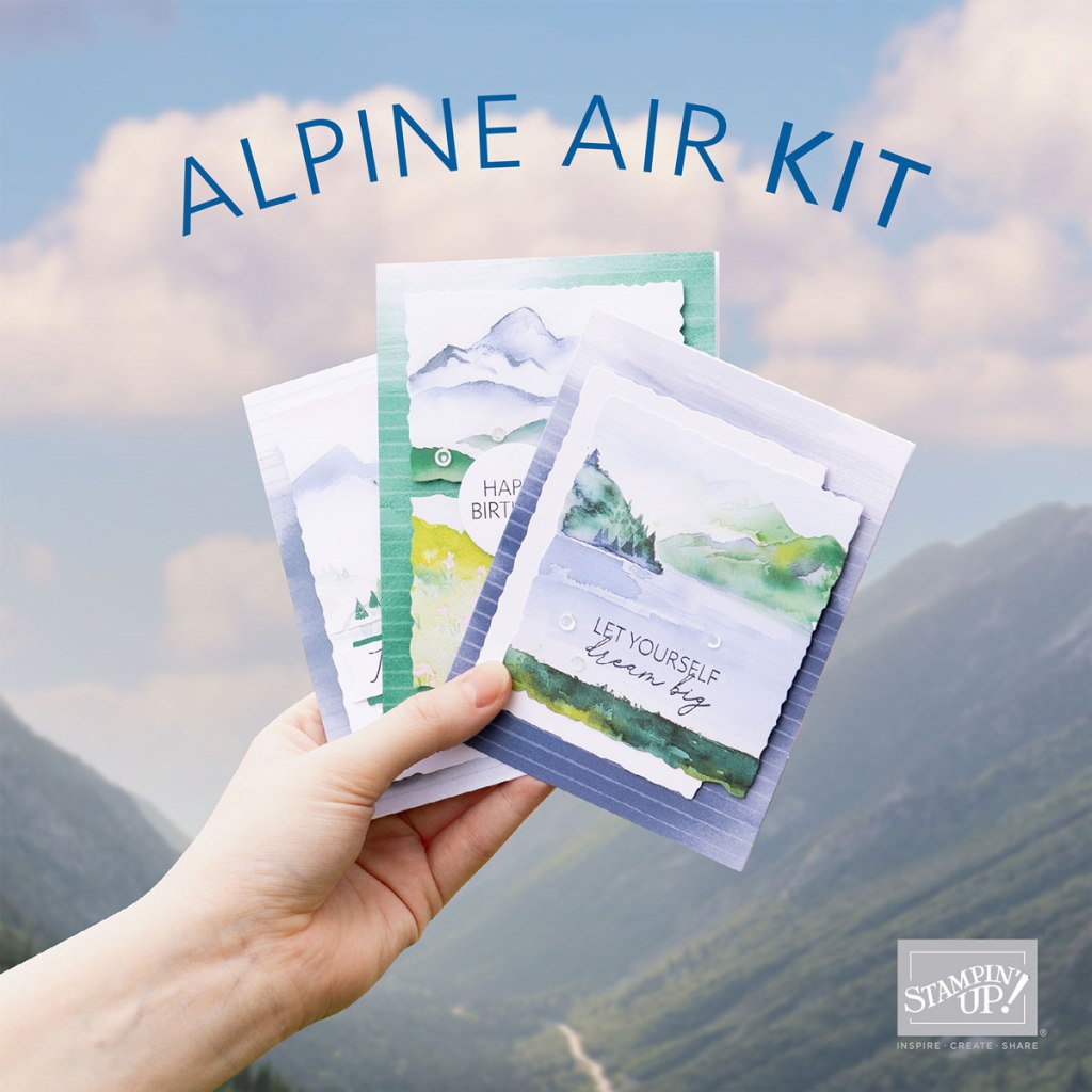 Alpine Air Kit makes 9 cards, 3 each of 3 designs! This kit includes the stamp set, block, ink, and so much more. Normally this kit is $22 but it is on sale for $19.80 for this month (as well as all of the other kits).
