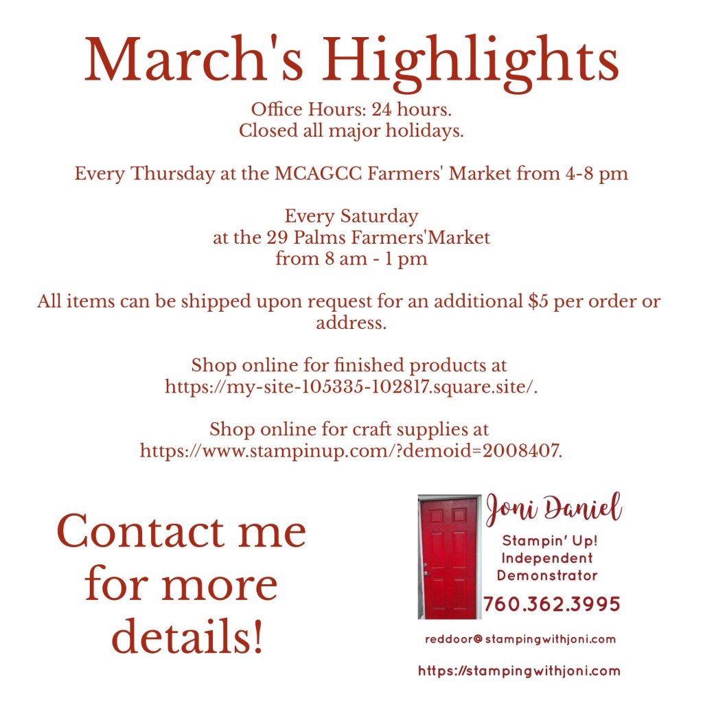 Please enjoy the highlights and holidays for this next month! Please note that there is a new Farmers’ Market on Thursday evenings on the base at the MCX parking lot on 5th Street! Hope to see you soon!